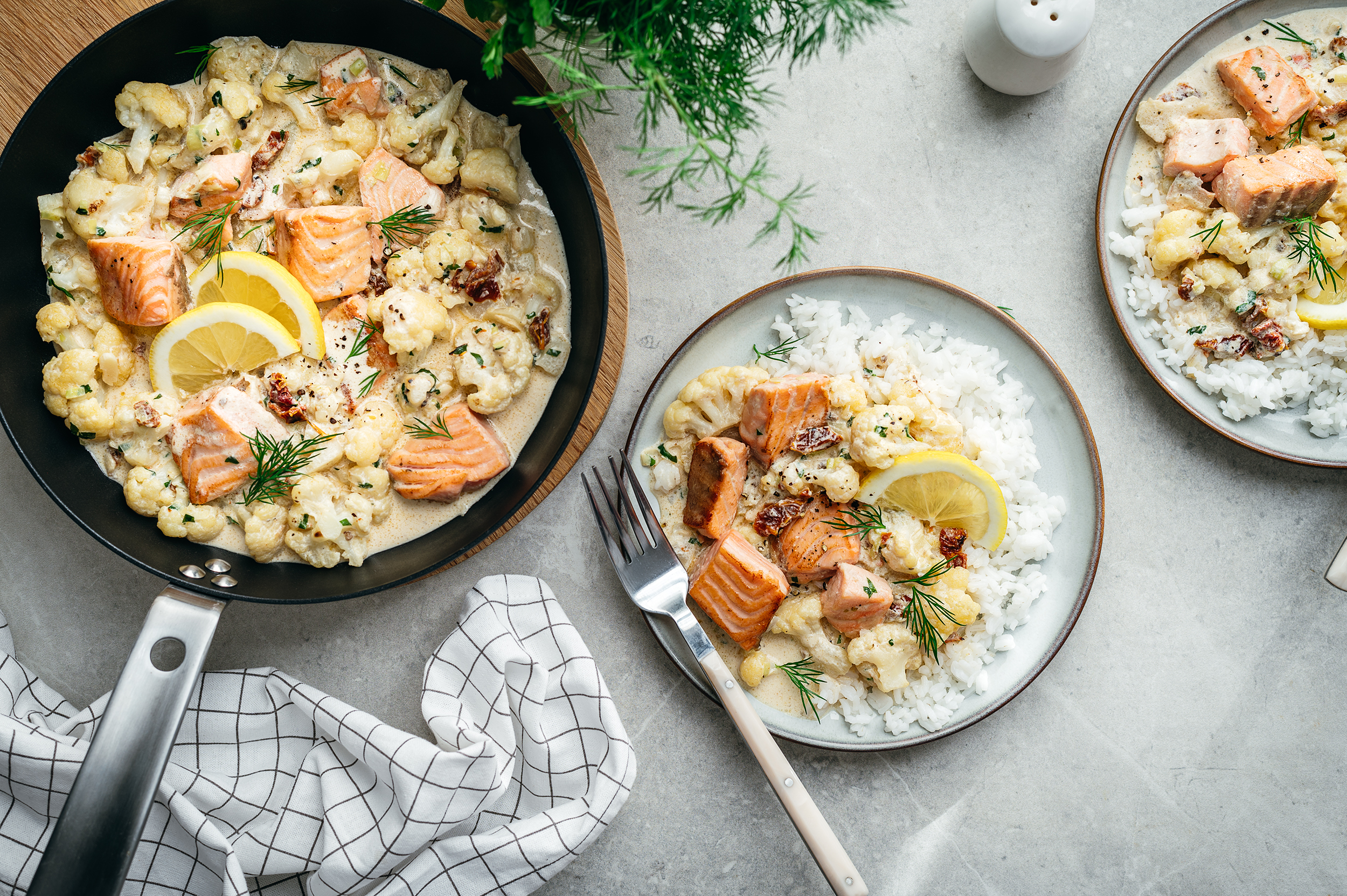 Koorekastmes lõhe lillkapsa ja päikesekuivatatud tomatitega